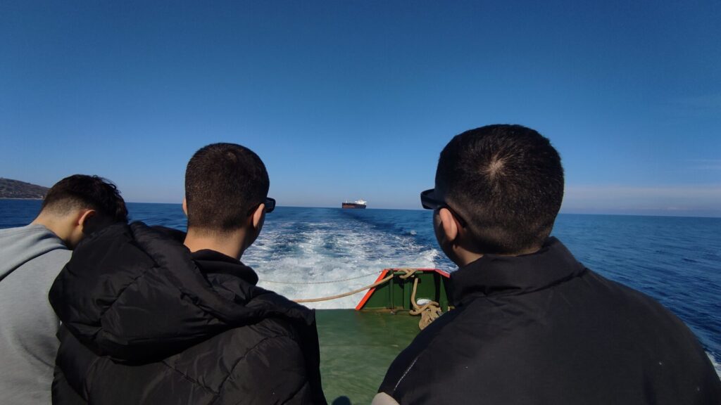 On the occasion of our vessel m.t. “Eurovision” calling at Kardamyla, the students of “Maria’s Home”, accompanied by Capt.Thomas Myofas, headed to the outer port by tug to welcome and greet the seamen and deliver local provisions and sweets.