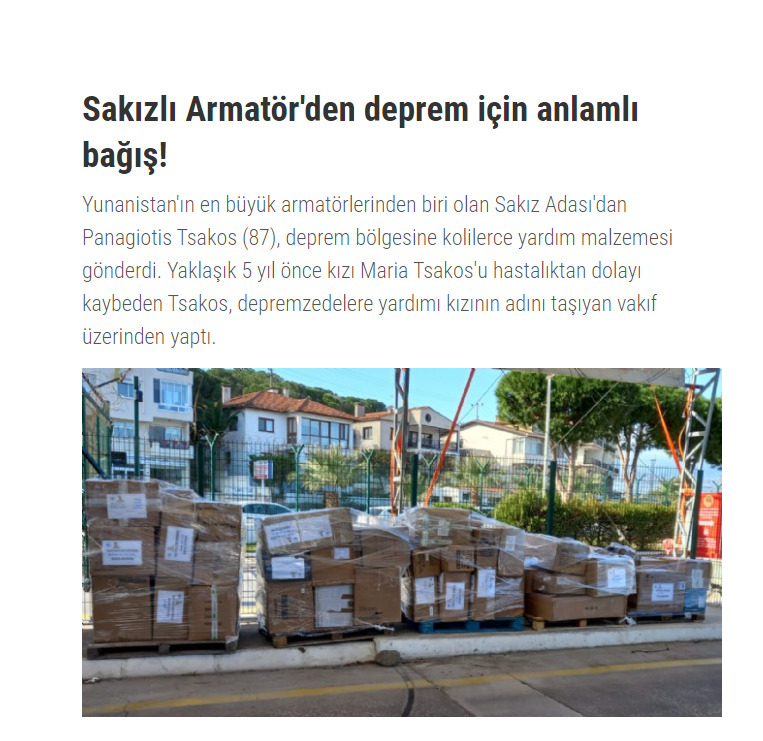 Το Ίδρυμα μας ανταποκρινόμενο άμεσα στην ανάγκη ανθρωπιστικής συμπαράστασης και βοήθειας, προς τον βαθιά δοκιμασθέντα, από τον καταστρεπτικό σεισμό της 6ης Φεβρουάριου 2023, λαό της Τουρκίας, προσέφερε συνολικά 262 δέματα με είδη ιματισμού, τροφίμων και φαρμάκων, δράση που αναγνωρίσθηκε και επαινέθηκε από τον τουρκικό τύπο.