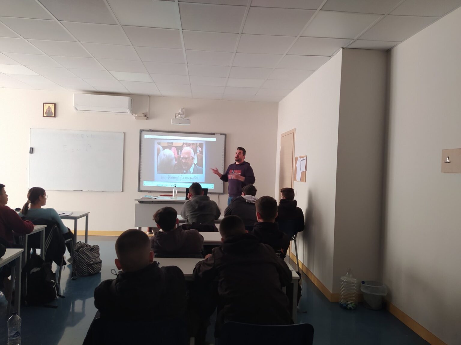 As part of the exemplary teaching of modern Greek Language and Science courses, a presentation about CERN was made by our teacher, Mr. Michael Xynos, who has visited CERN. Additionally, our Science teacher, Mr. Evangelos Gentis presented the elementary principles of particle physics.
