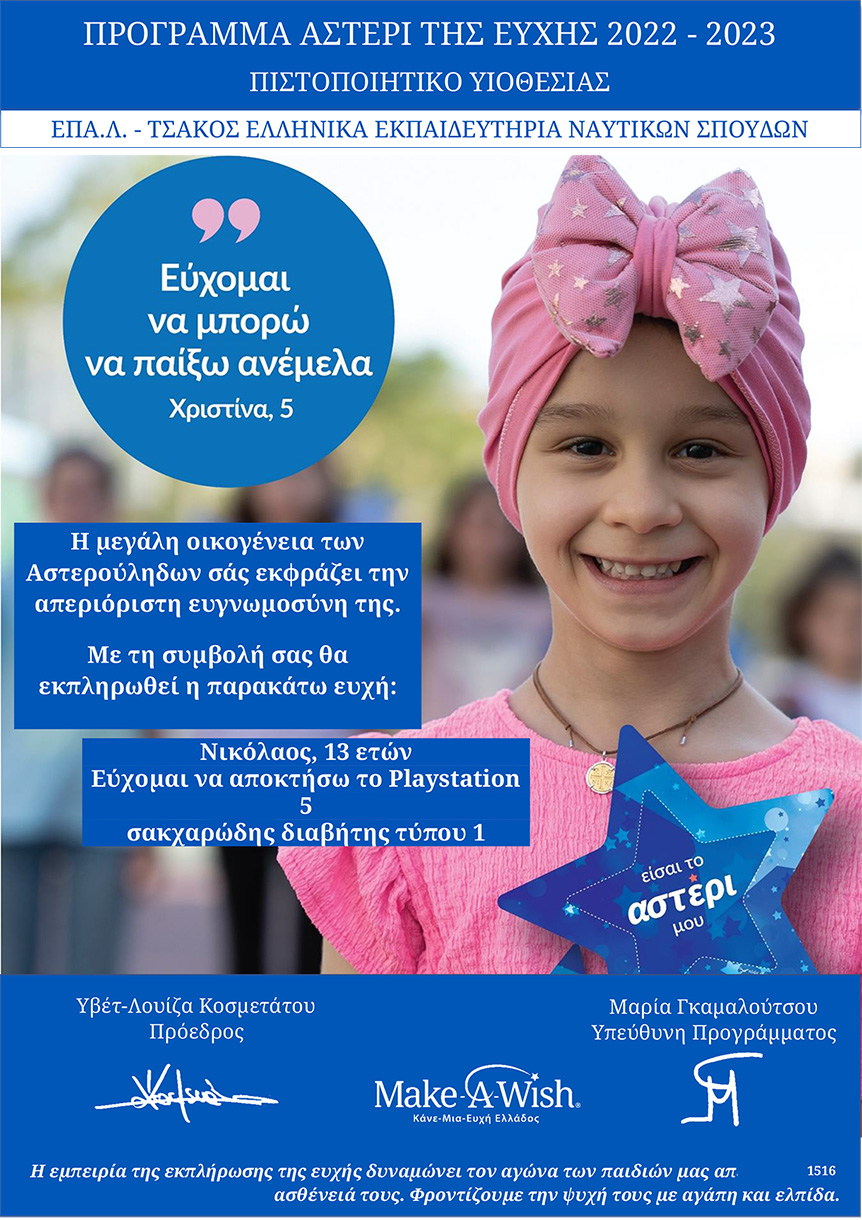 The teachers, administrative staff and students of our School raised money for the organization, “Make a Wish”, in order to contribute to the fulfillment of wishes of children suffering from life-threatening diseases, offering our strength, hope and support, to the everyday battle of these young children.